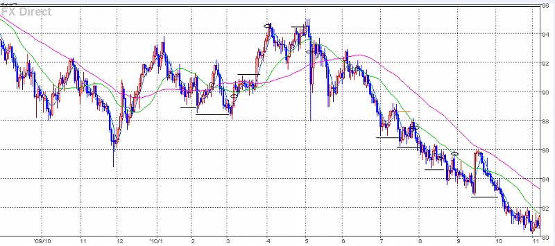 9/21寄り-10/28寄り 下降トレンドライン 維持
