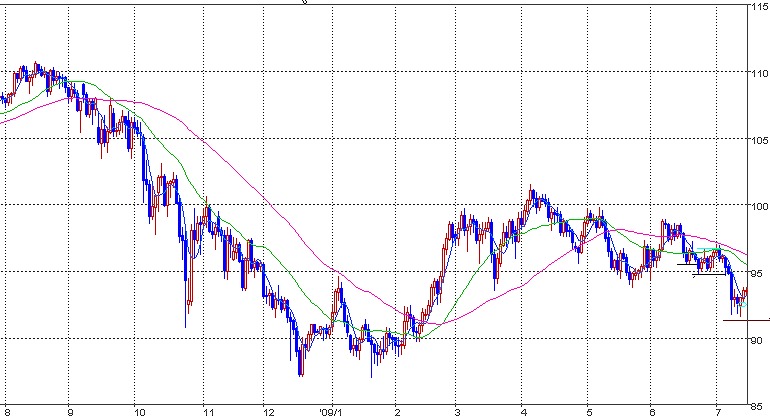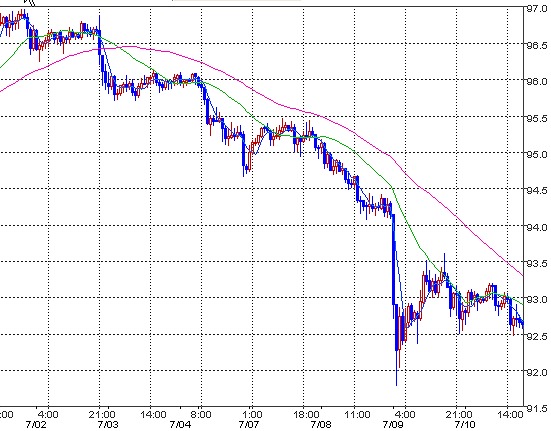 1時間足では97円どころから5日間の値幅5円、3段下げで大陰線2本の