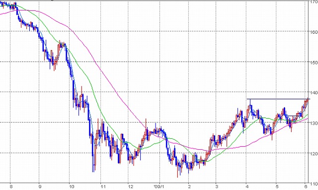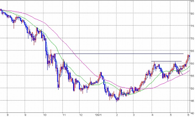 こうなると、昨年10月戻り高値、63円から65円を目指したいところ。