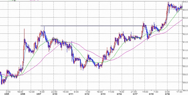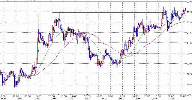 91.80円どころの保ち合いから放れて、2/10高値を上回っところが